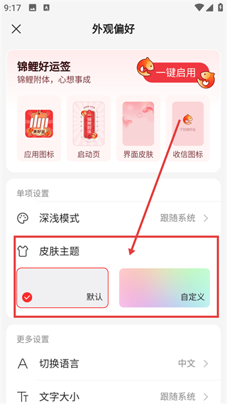 3、在外观偏好页面,选择【皮肤主题】下的【自定义】选项,可进入自定义皮肤的设置界面啦。