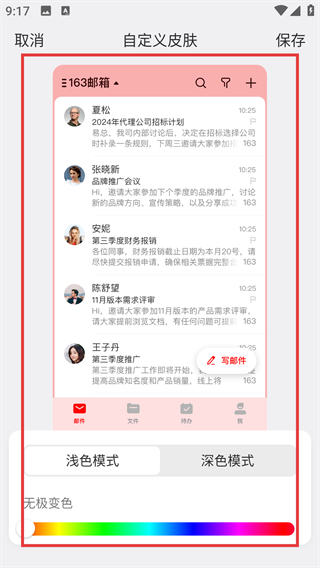 4、进入自定义皮肤页面,可切换深浅模式,还能通过无极变色条调整界面色调,设置后点击【保存】即可生效呀。