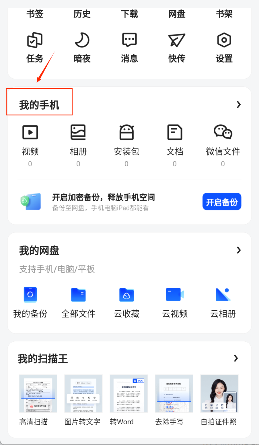 2、管理手机文件很方便,在“我的手机”区域有视频、相册、文档等分类。点击进入相应类别,可以查看和管理本地文件。