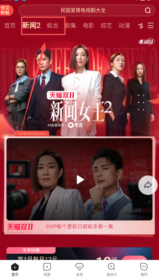 2、首页的“进站必看”区域汇集了热门剧集,如“新闻女王2”,带有“限免”标识的集数可以免费观看。
