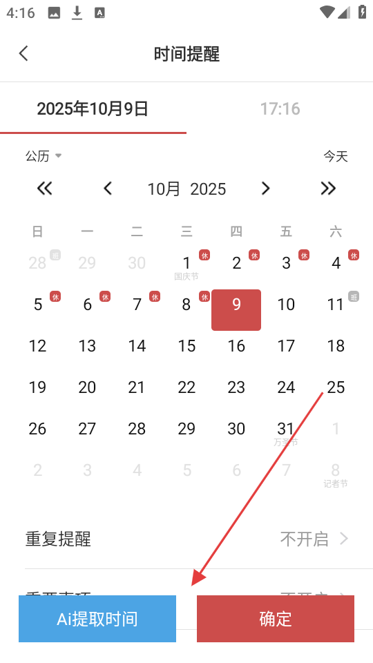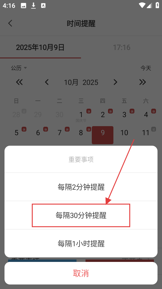 3、确认提醒时间后,我们选择重复提醒频率(如“每隔30分钟提醒”),设置重复提醒规则。