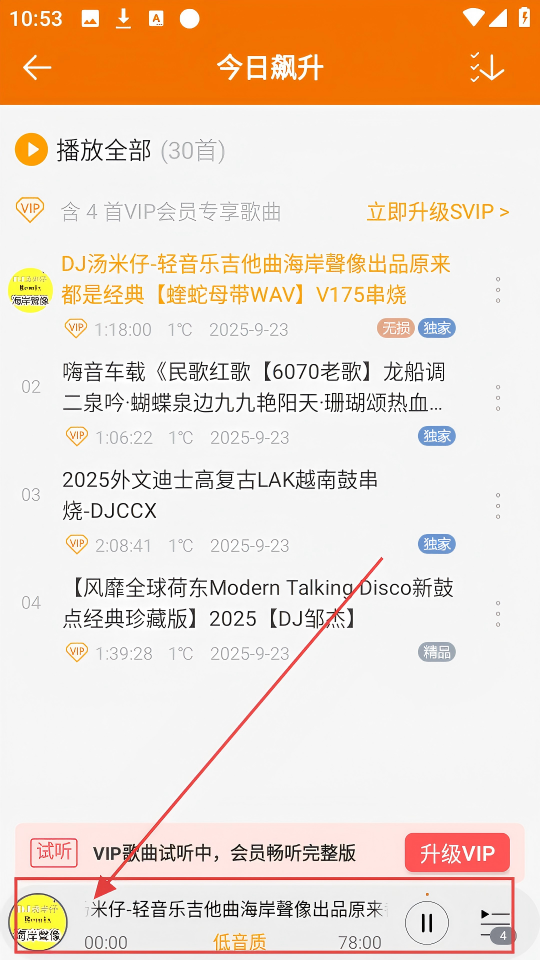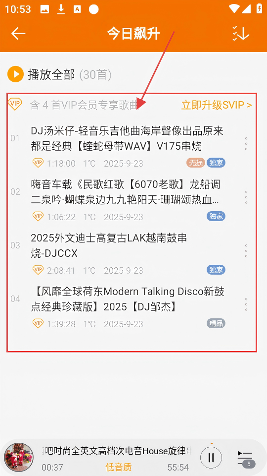 2、进入【今日飙升】页面,能看到多首热门歌曲,还有VIP专享歌曲提示,可挑选喜欢的歌曲试听哟。