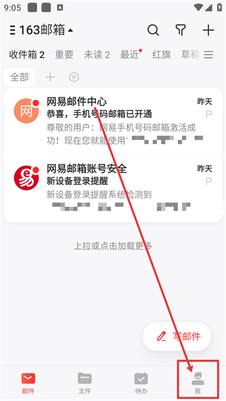 1、在163邮箱的邮件页,点底部【我】按钮能进入个人中心,后续可找到安全相关设置啦。