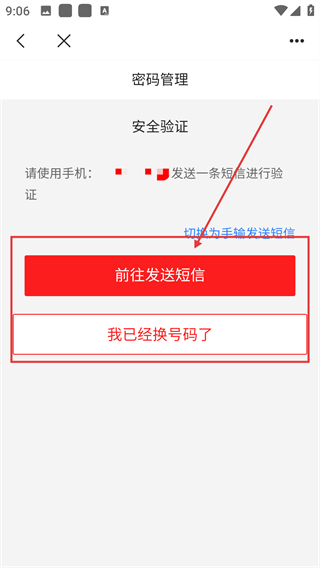 4、进入密码管理的安全验证页,点【前往发送短信】可完成验证,换号了也能选对应按钮哦。
