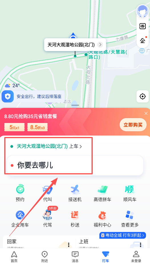 3、输入目的地打车时,除了实时叫车,还可以看看高德拼车和顺风车选项,适合不赶时间又想省钱的时候选择。
