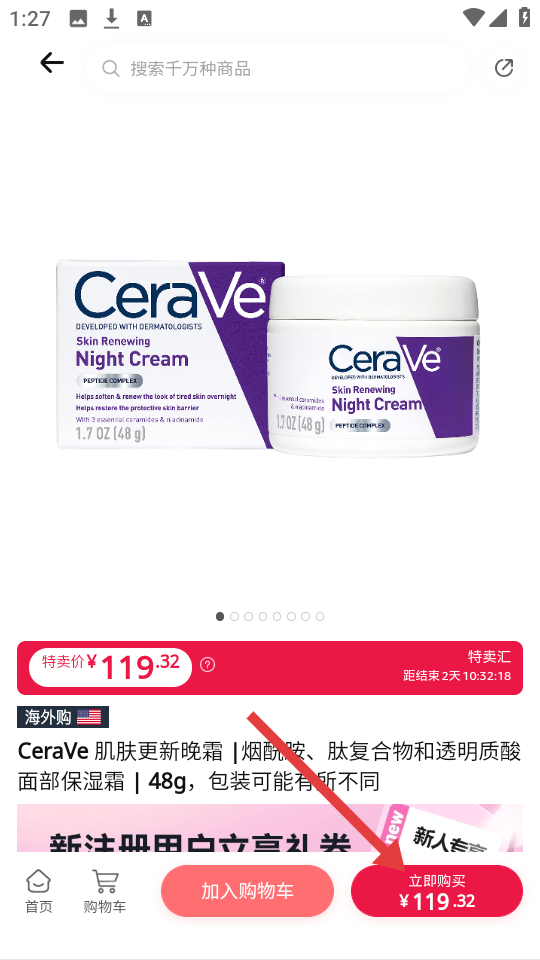 4、进入【CeraVe-肌肤更新晚霜】详情页,了解清楚商品信息后,要是喜欢,就点击【立即购买】下单就好啦。