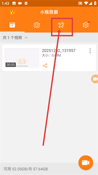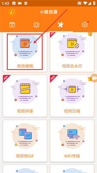 1、在小熊录屏主页面,点击顶部的工具图标,就能展开功能列表找到视频编辑入口啦。