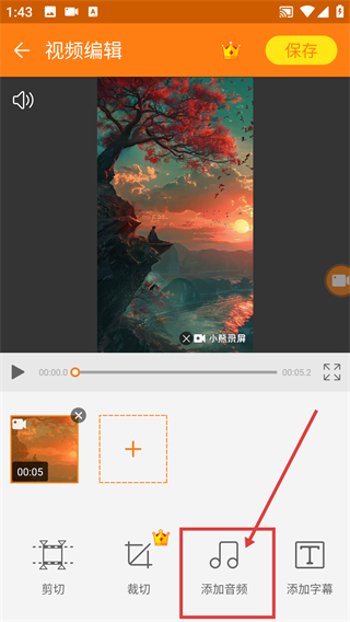 3、在视频编辑页,点击底部的【添加音频】选项,就能打开音频添加的功能界面啦。