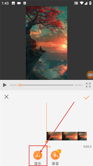 4、在音频功能界面,点击【音乐】按钮,就能进入音乐选择的流程来给视频配音乐啦。