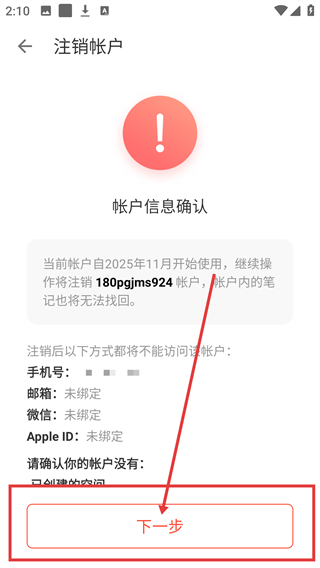 4、进入注销确认页,确认账户信息后点【下一步】,就能继续推进账户注销的流程啦。