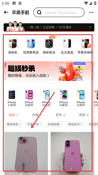 2、进入苹果手机页面后,可通过系列分类(如iPhone15系列)筛选商品,找到心仪的机型哦。