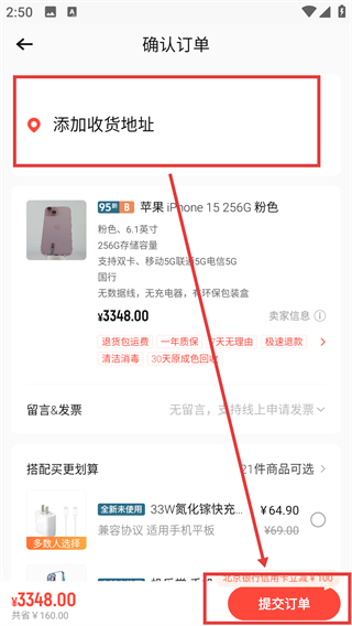4、在确认订单页,先添加收货地址,确认商品信息后点击【提交订单】,就能完成下单啦。