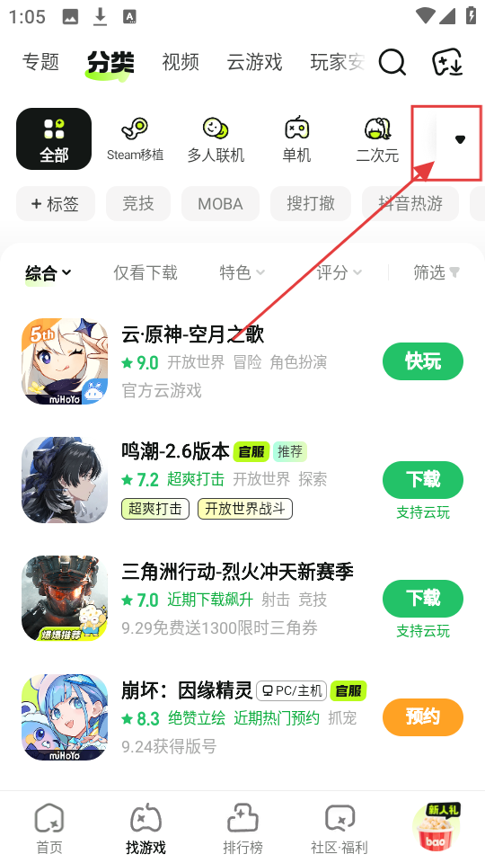 1、在软件“找游戏”页面,能看到分类相关区域,点击分类展开按钮,就能进入全部分类页面,去挑选游戏类型啦。