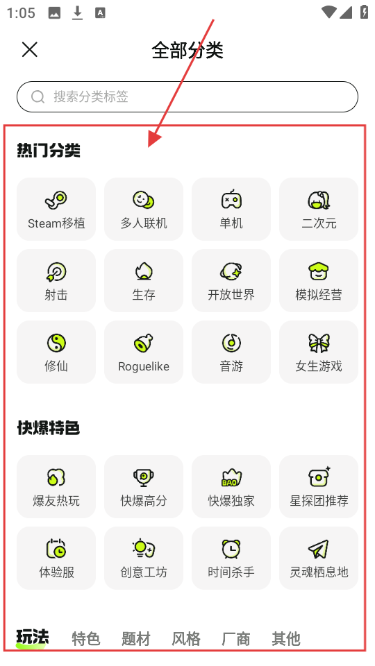 2、进入全部分类页面,有热门分类和快爆特色等板块,里面有各种游戏类型标签,可以根据喜好选择对应的标签哦。
