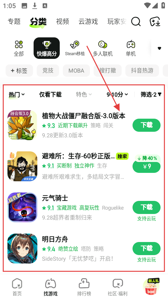 3、选好游戏类型后,页面会展示相关游戏,像《植物大战僵尸融合版-3.0版本》这类高分游戏就会出现啦。