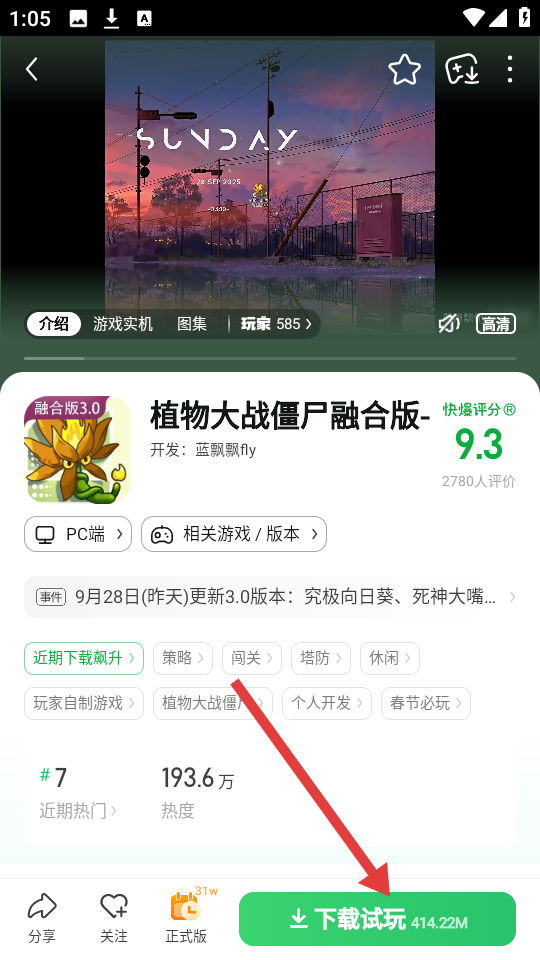 4、点击进入游戏详情页,比如《植物大战僵尸融合版》,能看到游戏介绍、评分等信息,最后点击【下载试玩】,就能下载游戏体验咯。