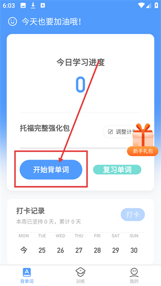 1、进入背单词页面后,点击【开始背单词】按钮,就能开启今日的单词学习任务啦。