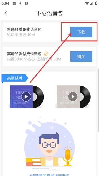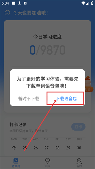 2、点击开始后会弹出提示框,选择【下载语音包】就能获取单词的发音资源,提升学习体验哦。