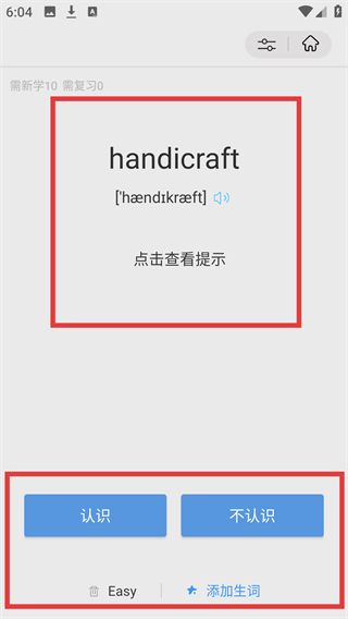 4、语音包下载完成后进入学习页,看到【handicraft】这类单词,可点击发音按钮听读音,再选认识或不认识哦。