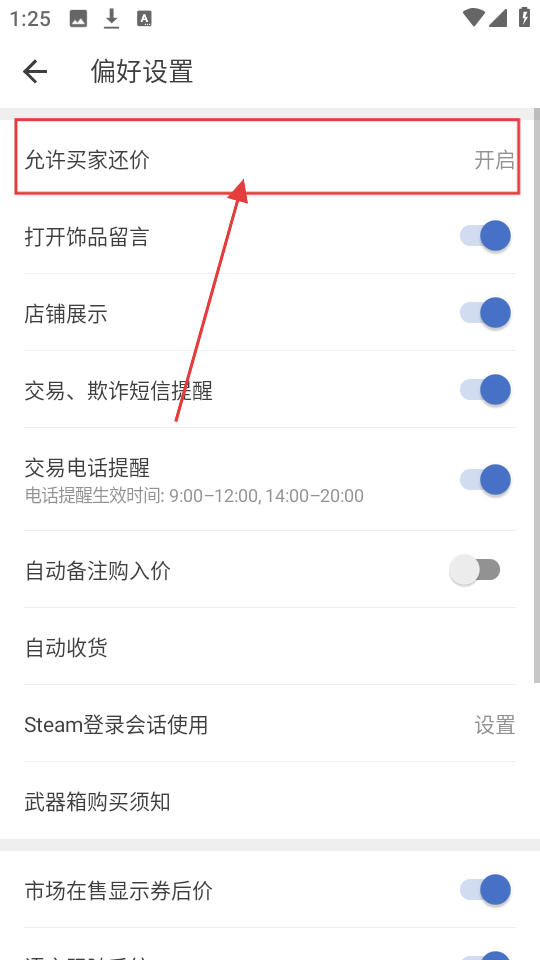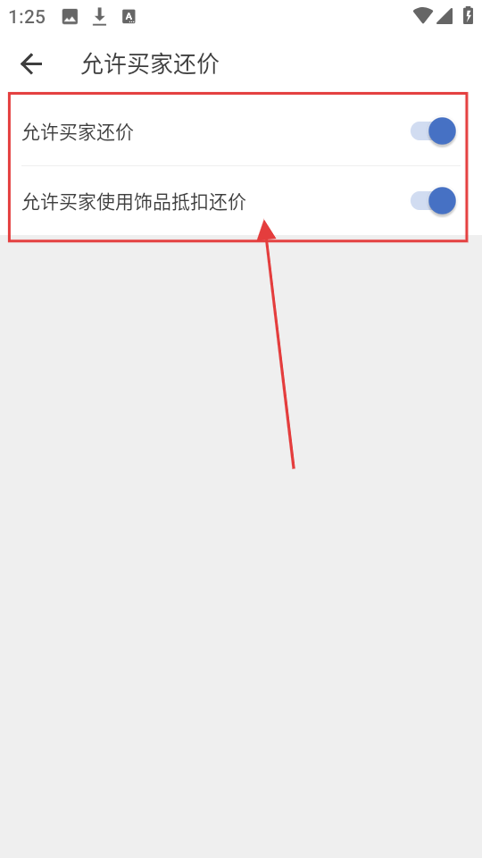 4、在允许买家还价设置页,开启相关开关,就能允许买家还价及用饰品抵扣还价啦。