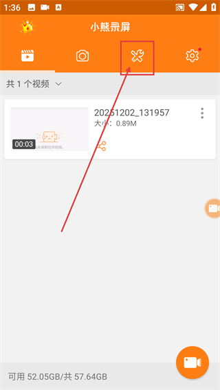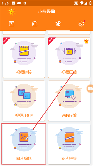 1、在小熊录屏首页点顶部工具按钮,能进入功能工具页面,后续可找到图片编辑这类功能啦。