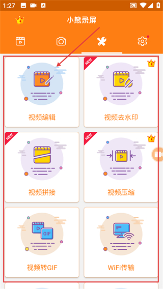 1、在小熊录屏主页面,点击【视频编辑】选项,就能进入视频编辑的操作界面开始处理视频啦。
