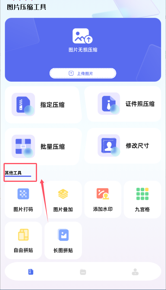 1、打开软件后先看顶部蓝色区域的"图片无损压缩"板块,中间那个醒目的"上传图片"按钮就是入口。