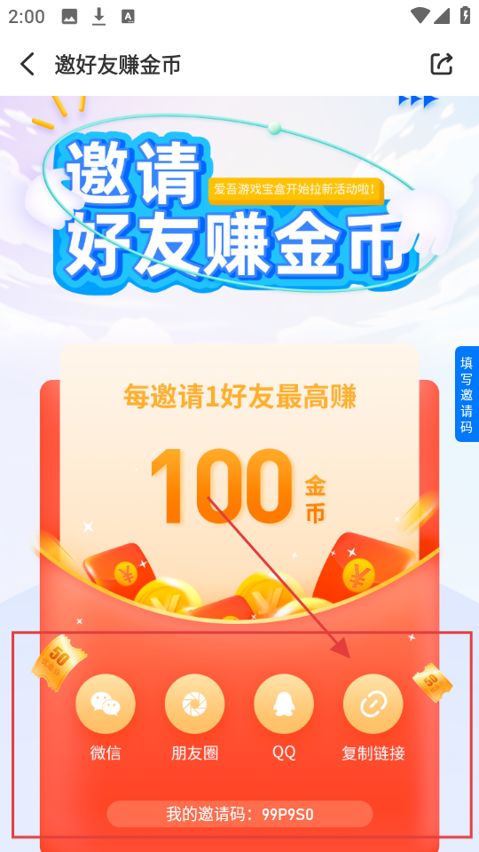 3、在邀请页面可以选【微信】【朋友圈】【QQ】【复制链接】等方式分享哦,快去邀请好友赚金币吧。