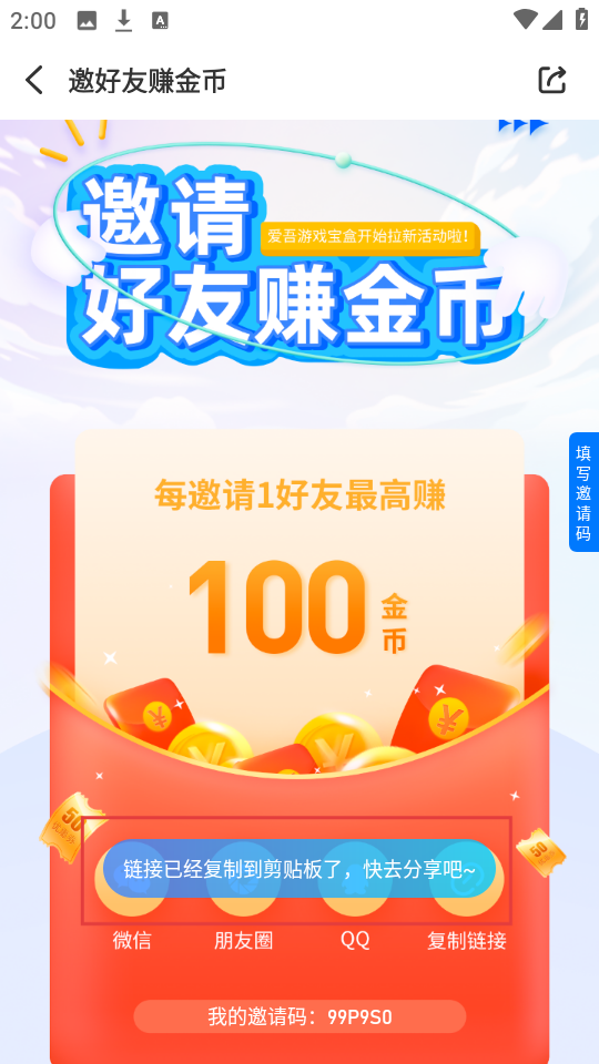 4、点击【复制链接】后,链接就复制到剪贴板啦,快去分享给好友赚金币呀。