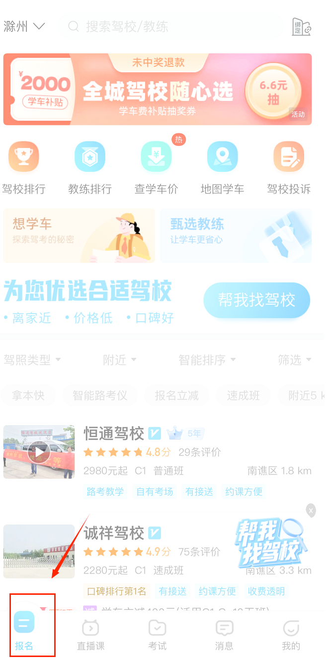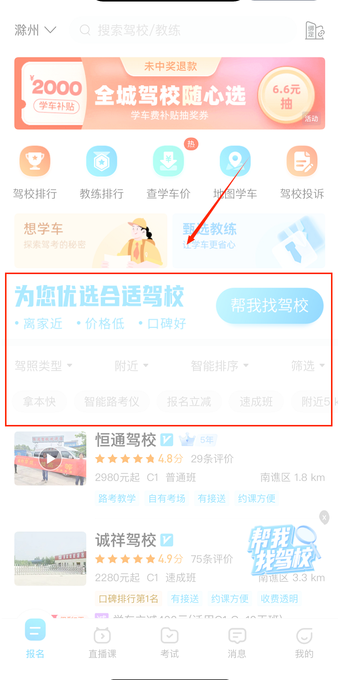 3、使用帮我找驾校功能,输入离家近、价格低、口碑好等需求条件。系统会自动筛选出符合条件的驾校列表,方便快速比较选择。