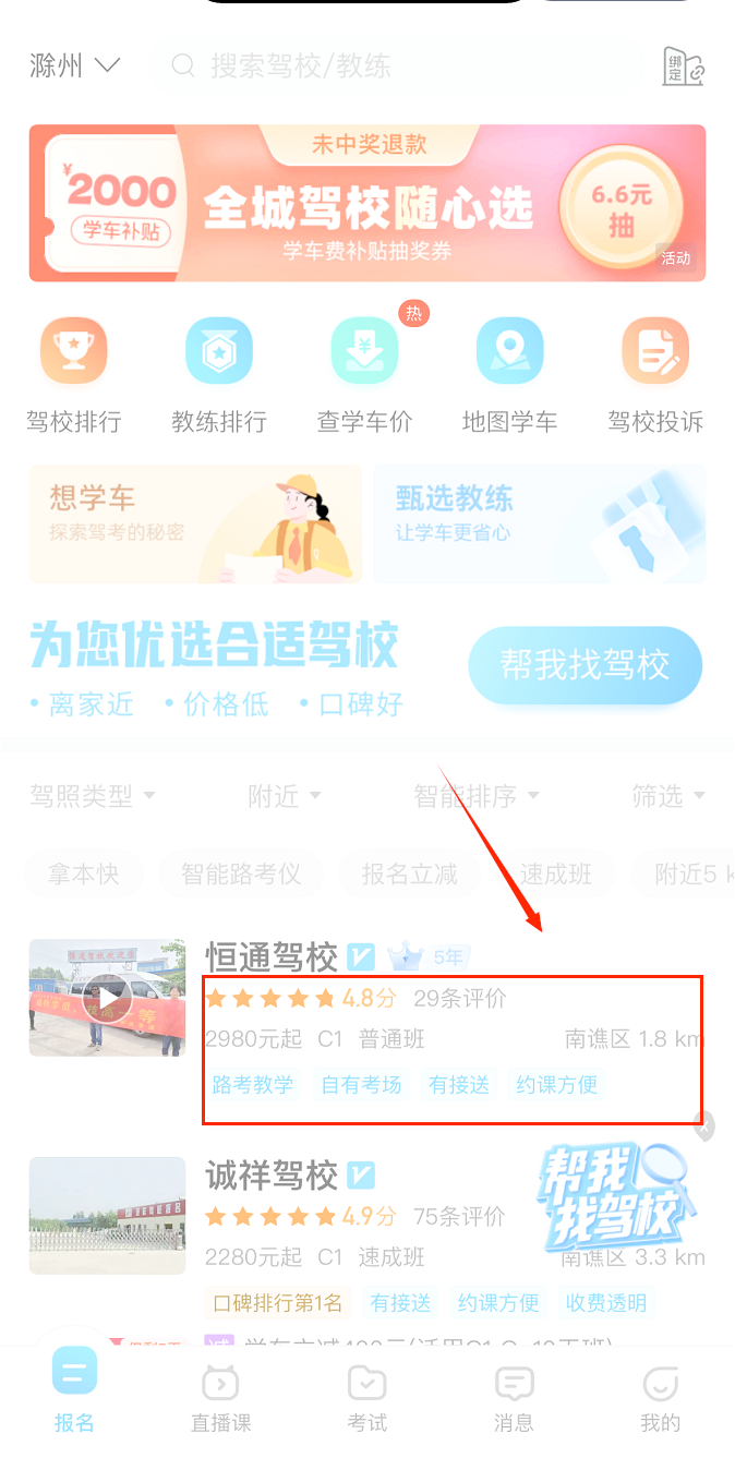 4、参考其他学员的评价和投诉信息,结合驾校的评分和特色标签如拿本快、智能路考仪等做出最终选择。可通过活动页面领取学车补贴。
