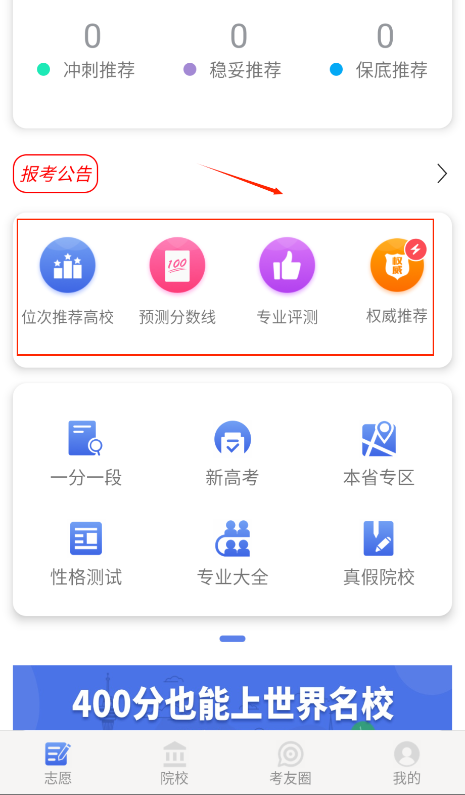 1、首次使用建议从首页开始探索,先查看"冲刺推荐"等三个推荐栏位,虽然初始显示为0但设置成绩后会动态更新推荐院校名单。