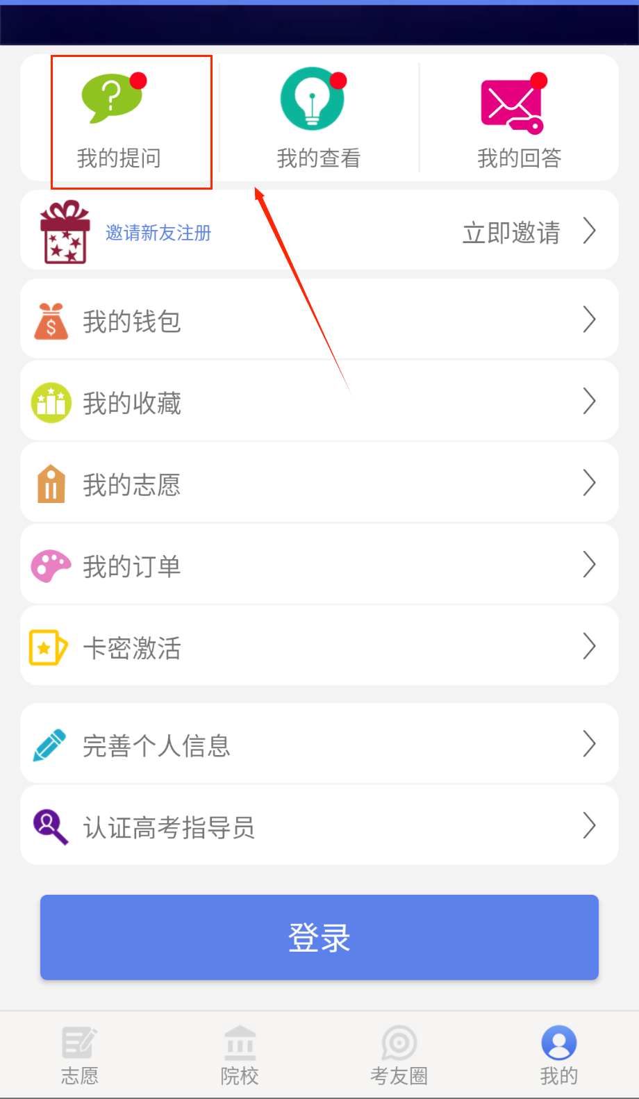 4、个人中心里的"我的提问"功能可以咨询问题,"邀请新友注册"还能获得额外服务积分,方便后续使用高级功能。