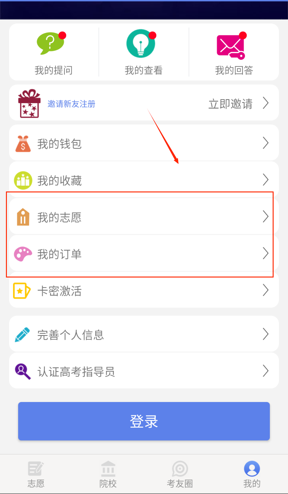 4、个人中心用于管理志愿方案与订单信息,考生可随时查看历史填报记录,并参与社区讨论,获取学长学姐经验分享。
