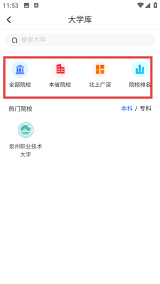 2、进入大学库页后,可选【全部院校】【本省院校】等分类,快速定位想了解的院校范围哦。