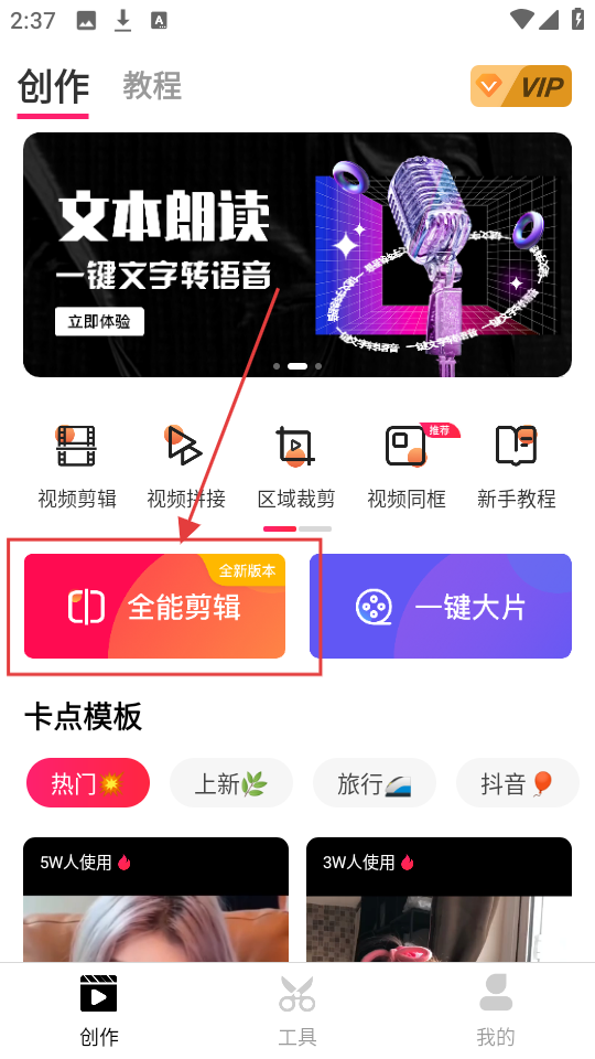 1、我们进入软件创作页面,若想进行全能剪辑操作,点击【全能剪辑】,就能进入素材选择页面啦。