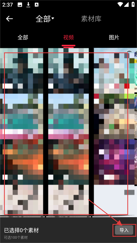 2、在素材选择页面,选择好要剪辑的视频素材后,点击【导入】,就能将素材导入到剪辑页面哦。