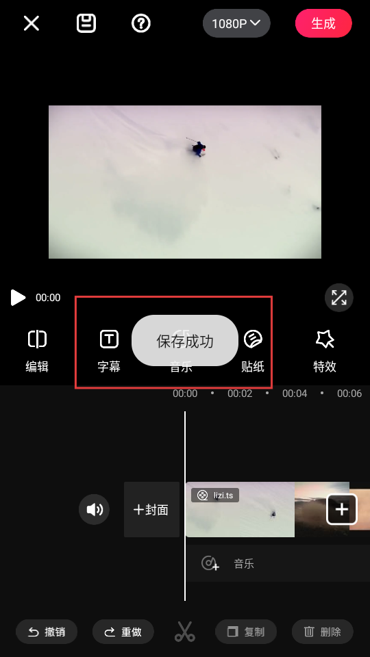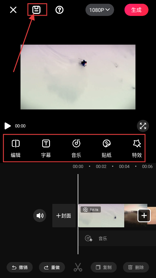 3、进入剪辑页面后,若想对视频进行编辑,可使用【编辑】【字幕】【音乐】等功能,还能点击保存图标进行保存操作呢。