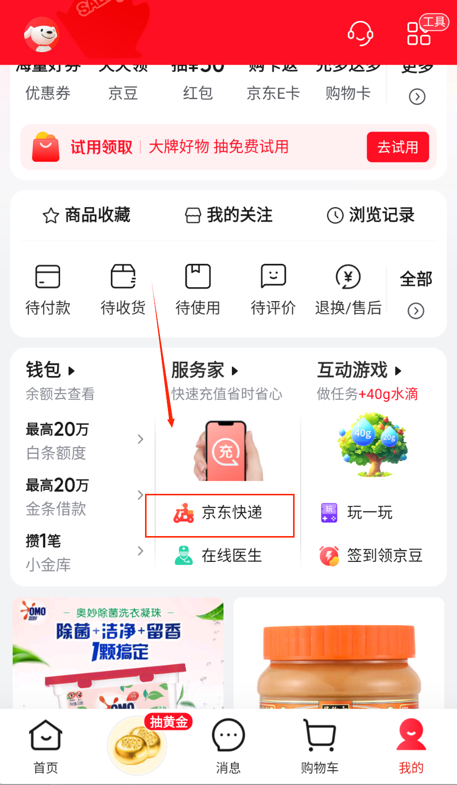 1、除了购物,APP内还有“京东快递”服务,在“我的”页面找到入口,填写寄件信息后预约上门取件,运费比线下更实惠哟。