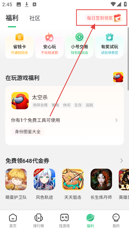 1、在福利页面,点击右上角【每日签到领奖】按钮,可进入每日签到页面,参与签到领奖励哦。