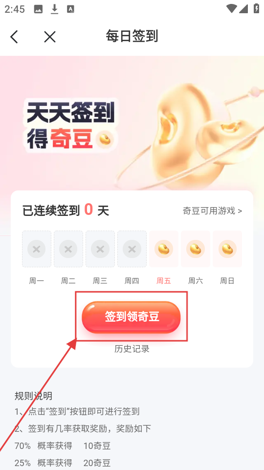 2、进入每日签到页面后,点击【签到领奇豆】按钮,可尝试签到领取奇豆奖励啦。