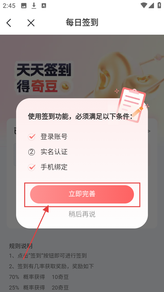 3、若弹出使用签到功能的条件提示框,点击【立即完善】按钮,可进入信息完善流程,满足签到条件哦。
