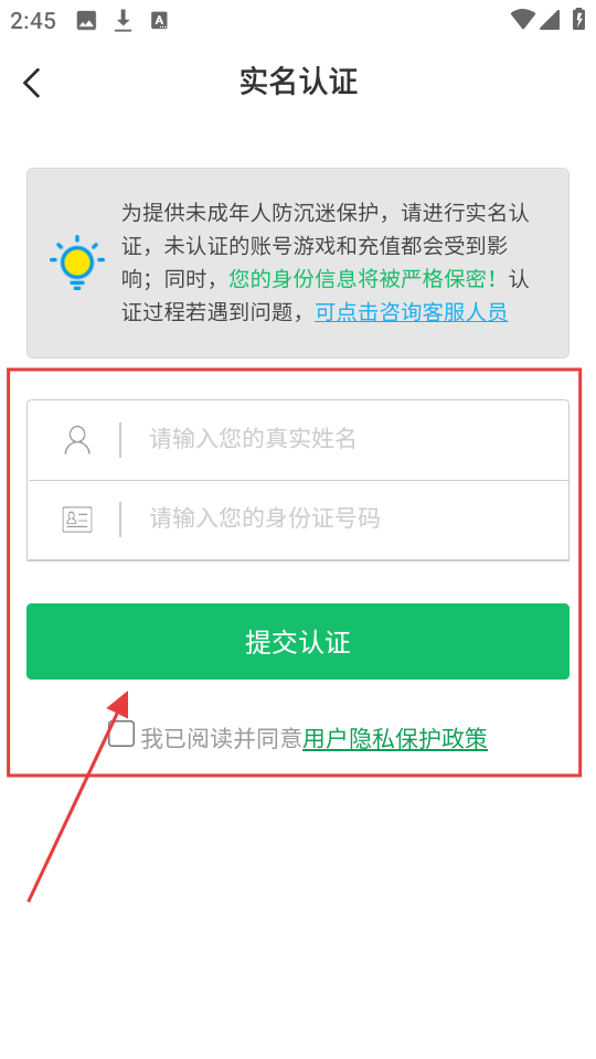 4、进入实名认证页面后,输入真实姓名和身份证号码,勾选同意协议后点击【提交认证】,即可完成实名认证啦。
