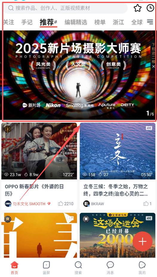 2、浏览内容时,主要使用首页的“推荐”页和顶部搜索栏,前者发现热门,后者精准查找作品与素材。