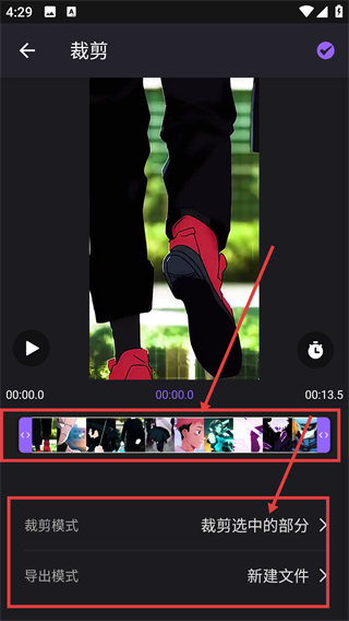 2、进入裁剪页后,拖动时间轴选中要保留的片段,再点击相关选项就能设置裁剪模式啦。
