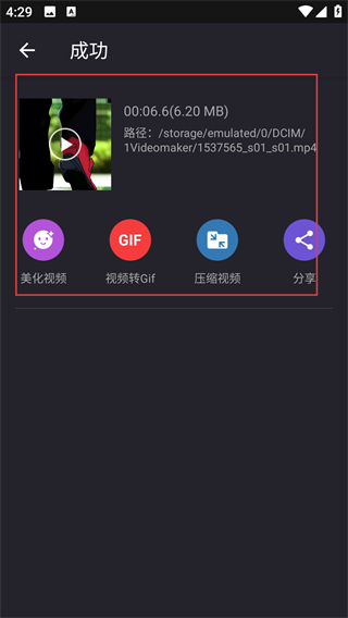 4、裁剪成功后会显示视频路径,还能直接用【美化视频】【分享】等功能处理成品哦。