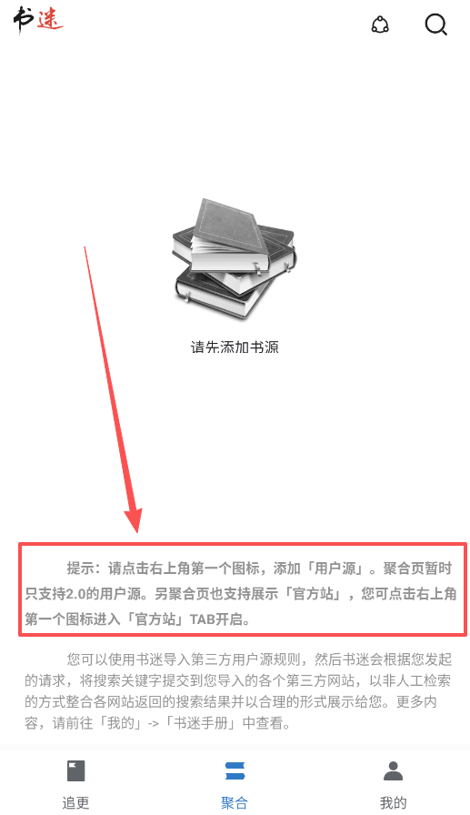 1、要畅游书海,首先得拥有钥匙,请进入书源管理界面,点击右上角图标,根据提示导入第三方用户源。