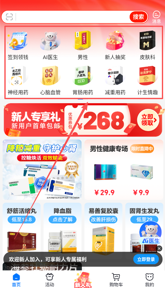 2、首页设计得很清晰,上方有搜索框和“消息”入口,中间是“签到领钱”、“AI医生”等快捷功能图标。