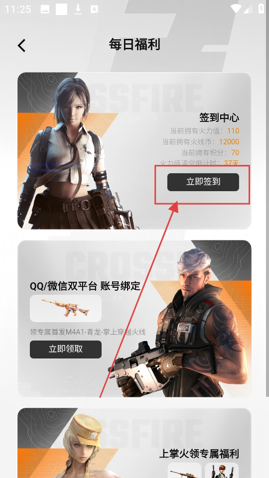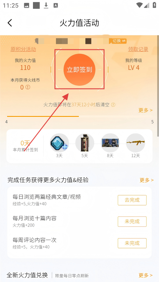 3、在火力值活动页面,点击【立即签到】,可以获取火力值等奖励,还能看到签到进度呢。