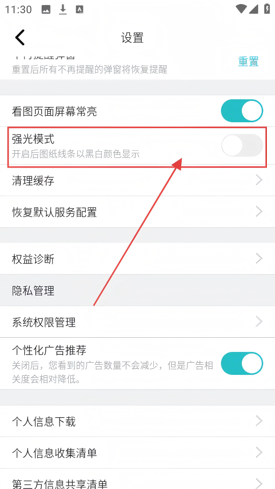 3、进入设置,找到【强光模式】选项,它能让图纸线条以黑白颜色显示,根据需求选择开启或关闭啦。